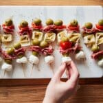 - Step 4: Assemble the skewers by layering one piece each of mozzarella, salami, roasted red pepper, tortellini, fresh basil, artichoke heart, and green olive on wooden skewers or toothpicks.