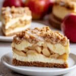 A slice of layered apple crumb cheesecake on a white plate, showing four distinct layers: a thick golden brown crumbly crust at the bottom, a pale creamy cheesecake layer above it, topped with a warm light brown apple filling with visible apple chunks, and finished with a crumbly streusel topping sprinkled with a light glaze. In the background, a second similar slice sits blurred on another white plate, with three whole red apples and a half apple also blurred behind, all resting on a white marbled texture surface. Photo taken with an iphone --ar 4:5 --v 7