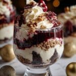 Keywords: Black Forest Trifle, Christmas dessert, layered trifle, chocolate cake dessert, holiday trifle, whipped cream dessert, cherry pudding trifle