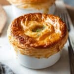 - Assemble the pies: Brush the edges of each pot with the egg wash. Place the puff pastry on top, folding the excess pastry down to seal the filling inside. Brush the top and sides of the pastry with egg wash for a golden finish. Using a sharp knife, cut a ½-inch slit in the center of each pastry to allow steam to escape.