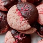 Delight in the sweet and fruity flavors of these Chocolate Covered Strawberry Cookies, featuring a tender cookie base infused with strawberry jam and crushed freeze-dried strawberries, topped with a luscious drizzle of melted dark chocolate. Perfectly soft in the center with a hint of pink hue, these cookies are a charming treat for any occasion.