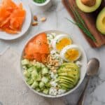 A light and nutritious Cottage Cheese Smoked Salmon Salad featuring creamy cottage cheese, savory smoked salmon, fresh cucumber, avocado, and a perfectly boiled egg, topped with crunchy almonds and chives for a satisfying meal or snack.