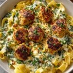Delicious and creamy Chicken Ricotta Meatballs Alfredo combines tender ground chicken meatballs blended with creamy ricotta and spinach, baked to perfection and tossed in a rich Alfredo sauce for a comforting Italian-inspired dish.