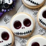 These Easy Jack Skellington Cookies are a fun and festive treat perfect for Halloween or any time you want to delight fans of The Nightmare Before Christmas. Tender, dairy-free shortbread cookies are sandwiched with black cherry jam and decorated with spooky icing faces for a playful twist.