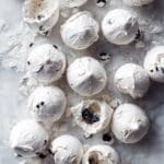 The image shows many small, round, white meringue pieces scattered on a white marbled textured surface. Each meringue is slightly rough and cloudy white, with small dark spots inside indicating blueberries or other dark fruit pieces baked into them. Some meringues are whole and round, while others are broken in half, revealing their airy, hollow inside with visible fruit pieces. The soft light makes the texture of the meringues and the marbled surface clear and bright. photo taken with an iphone --ar 4:5 --v 7