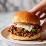 Keywords: Philly cheesesteak, sloppy joes, ground beef recipe, comfort food, easy dinner, cheesy beef sandwich, brioche buns