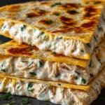 A delicious and high-protein chicken ranch quesadilla made with low-carb tortilla, shredded rotisserie chicken, creamy Greek yogurt, and a blend of cheeses. This easy-to-make skillet quesadilla offers a crispy exterior with a melty cheesy filling, perfect for a quick and satisfying meal.