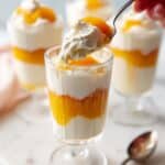 4. Assemble the dessert cups: Prepare 4 large or 6 small serving cups such as glass ramekins or ice cream glasses. Spoon the peach mixture evenly into the cups, making sure to include the peach juices for extra flavor.