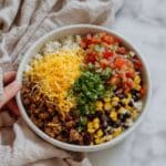 A quick and hearty Ground Beef Burrito Bowl featuring flavorful taco-seasoned beef, fluffy rice, black beans, corn, cheddar cheese, and fresh salsa – all assembled for a satisfying and customizable meal perfect for busy weeknights.