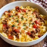 This Slow Cooker Amish Country Tomato Beef Casserole is a comforting, hearty dish made with lean ground beef, uncooked wide egg noodles, and a tangy tomato soup sauce. Cooked low and slow, it’s an easy, hands-off meal perfect for those busy days when you want a warm, cheesy casserole without the fuss of browning meat or pre-cooking noodles.
