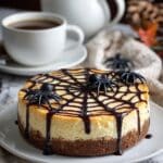 Keywords: Spider Web Cheesecake, Halloween dessert, chocolate crust cheesecake, creamy cheesecake, chocolate decoration, water bath cheesecake, holiday dessert