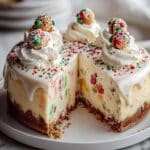 - Assemble and Garnish: Once the sugar cookie base has completely cooled, generously sprinkle the prepared sugar cookie crumble over the crust. Finish by adding ⅓ cup of Christmas sprinkles (jimmies) on top to add festive color and texture.